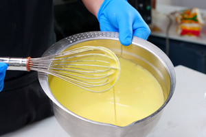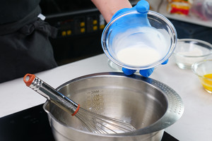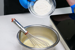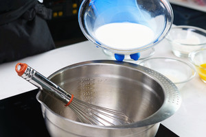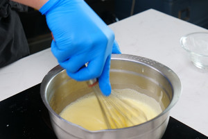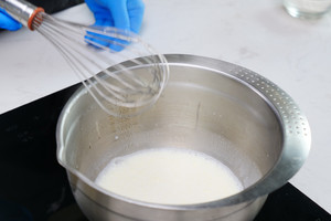3. 加面粉时,成热加入,如果温度低的话,要隔水加热并搅拌至粘稠