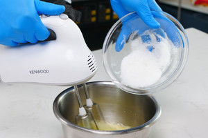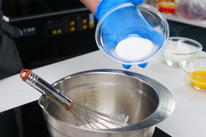 接下来打发蛋白,蛋白、盐、柠檬汁打发到起泡后,分三次加入砂糖,然后快速打发。