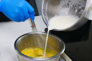 煮开后离火,快速冲入到搅散的蛋黄里,边充入边快速搅匀。