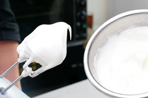 最终把蛋白打发到湿性发泡8成,提起有小尖角,小弯钩,不流动的状态。