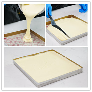 13 面糊拌匀后,抹平在28*28的烤盘里,即可烘烤。