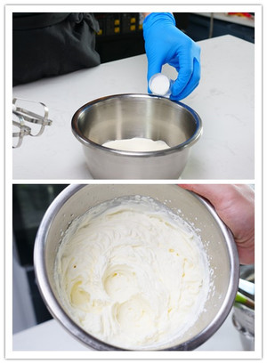 14 蛋糕烤好后,我们打发奶油,用来组装。奶油的含糖量我以前是10%,后来降到了4%,大家可以根据自己的喜欢的甜度来选择。