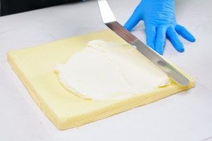 15 蛋糕烤好并且晾凉后,我们来组装蛋糕卷,打发好的奶油抹平在蛋糕表面。