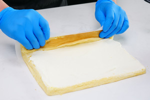 16 抹平后,我们用:折、压、提、卷、收的方式,把蛋糕卷起来,接口的位置压在下面。