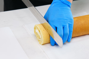 17 卷好后,我们用火枪烫刀,切掉蛋糕两边,这样看起来会更工整。