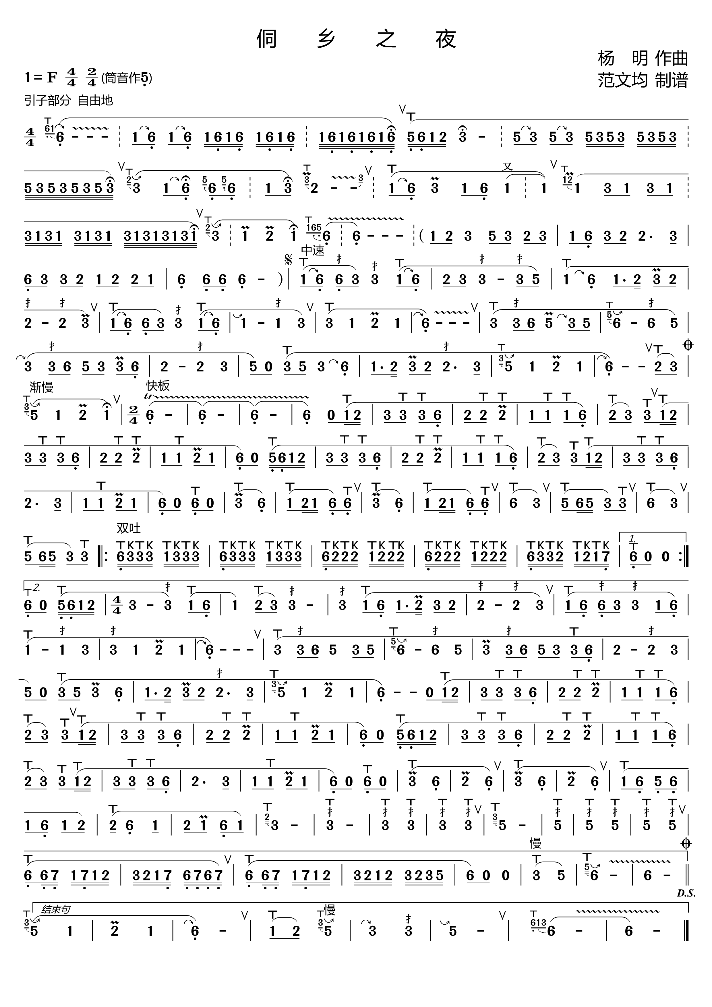 侗乡之夜是一首葫芦丝独奏曲,曾被收录于葫芦丝考级曲目选曲之一,难度大概为6~7级,常用大低音葫芦丝演奏。