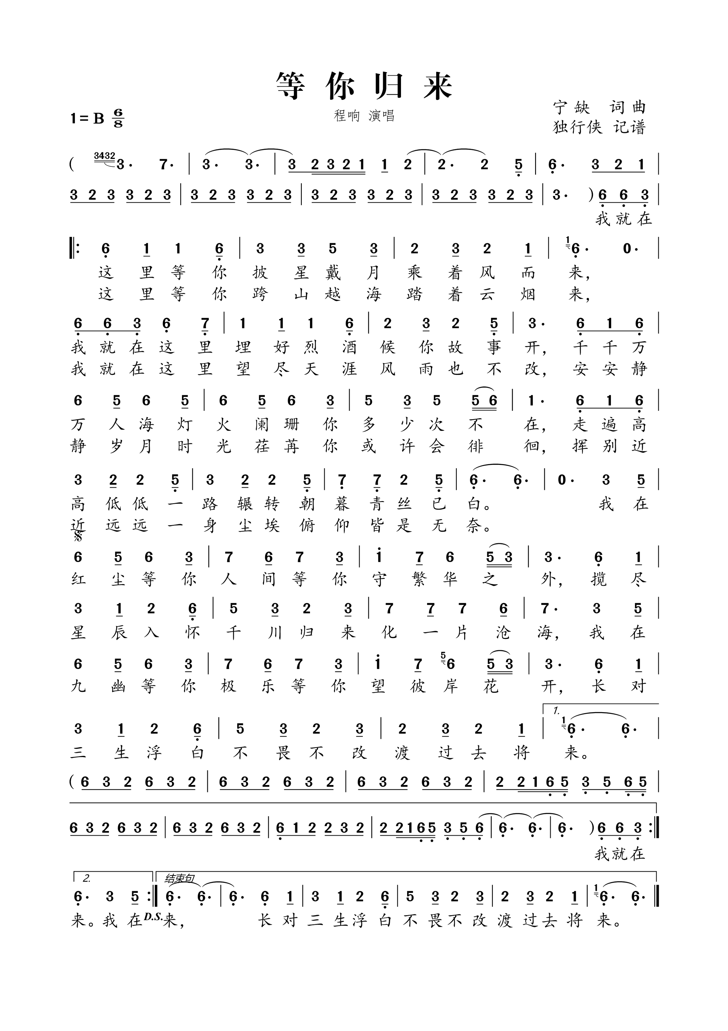 歌曲“等你归来”是由音乐人宁缺作词、作曲,由程响演唱的歌曲