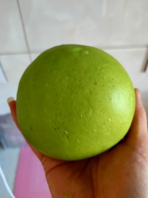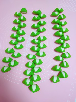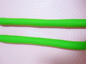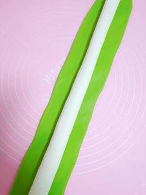 4 绿色面包住白色面,接口捏紧,滚成长条,粗细自己决定哈