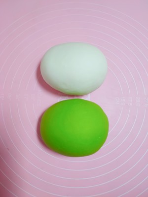 2 同样的方法,用清水和白色面团一块,醒面半小时左右,两种颜色面团大小差不多,我没称重,多包就多和面,少做就少和面