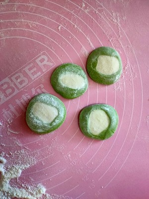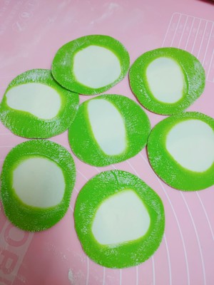 3 绿色面搓长,擀成长方形厚面皮,白色面搓长,放在绿色面皮里,少放干面,让两色面能粘一起