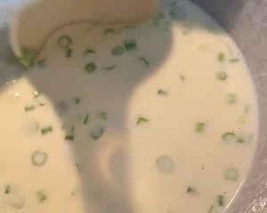 1 多次少量把水加入面粉里搅拌至无颗粒面糊状,加入适量盐,葱花,1个鸡蛋和1大勺食用油(或者20克液化黄油)一起搅拌均匀至视频中的状态。
