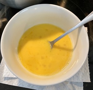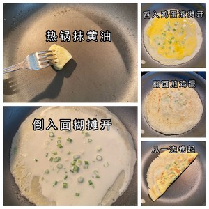 2 4个鸡蛋打散备用。打撒的蛋液一会比较容易在面饼上摊开。(可以按自己喜欢加少许盐和胡椒粉调味)