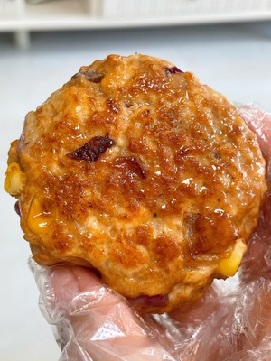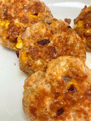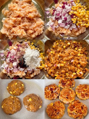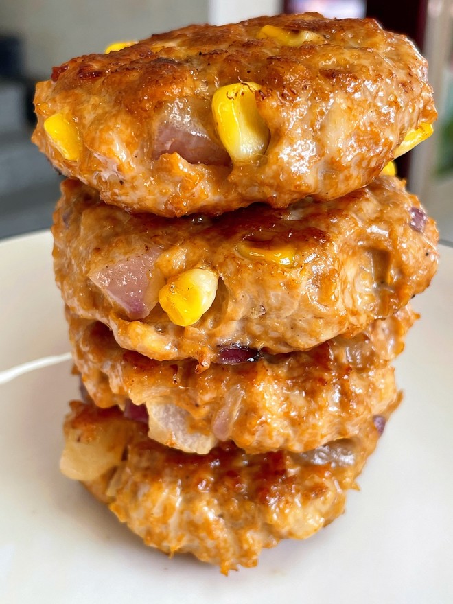 1 鸡胸肉剁成肉沫➕洋葱丁➕玉米粒,倒入所有腌制料搅拌均匀,盖上保鲜膜腌制半小时,取适量肉泥整成小圆饼,少油小火慢煎至两面金黄即可出锅!