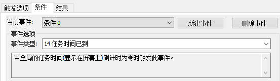第二个触发需要多次执行,用于循环倒计时,设置类型为 2 - 触发多次,设置条件为 14 任务时间已到,与第一个触发一样执行同样的那 3 个结果。