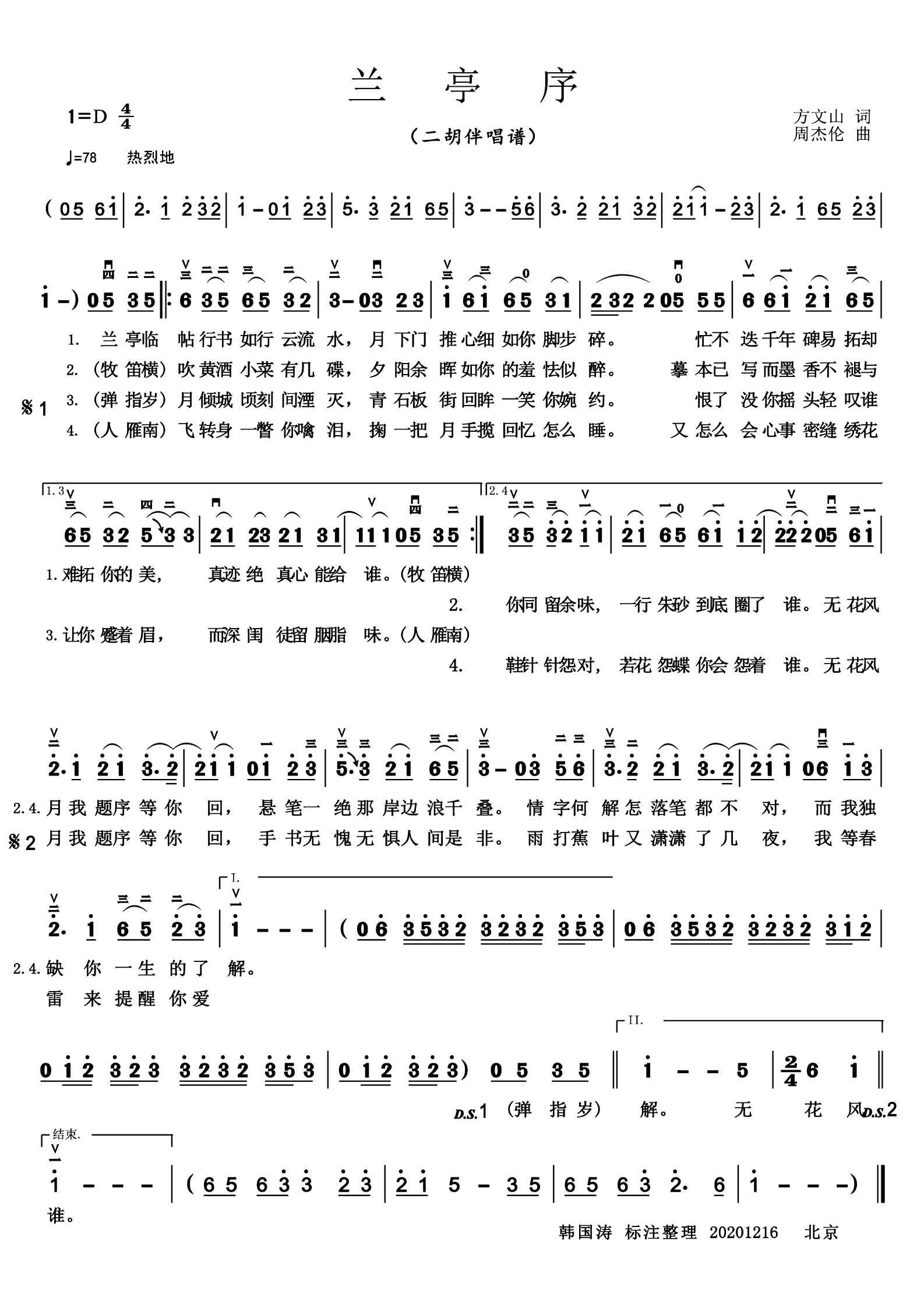周杰伦 方文山 兰亭序 数字简谱 曲谱 带歌词
